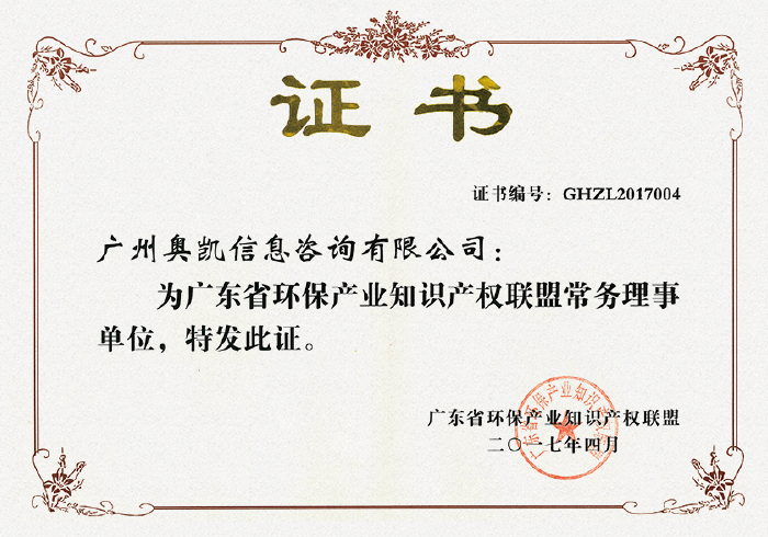 • 广东省环保工业知识产权同盟常务理事单位证书